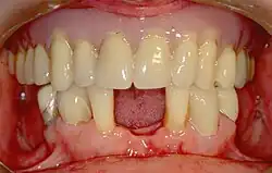 Dentures are prosthetic appliances fabricated to fill the gaps of missing teeth. Conventional style dentures are removable appliances and are designed to be either a complete denture or a partial denture anchoring to adjacent teeth. There are many denture designs, some which rely on chemical bonding or clasping onto teeth or attached via dental implants known as fixed prosthodontics.[12]