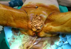 | Man, aged 63, with a massive cauliflower-like penile mass with several urinary fistulae making the penile shaft indistinguishable. | |