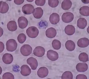 | Two giant platelets (stained purple) are visible in this image from a light microscope (40×) from a peripheral blood smear surrounded by red blood cells. One normal platelet can be seen in the upper left side of the image (purple) and is significantly smaller in size than the red blood cells (stained pink). | |