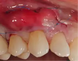 In periodontology, gingival grafting, also called gum grafting or periodontal plastic surgery,[1][2] is a generic term for the performance of any of a number of surgical procedures in which the gingiva (gum tissue) is grafted. The aim may be to cover exposed root surfaces or merely to augment the band of keratinized tissue.