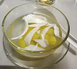 Despite the health risks in certain cases, the nut-like kernels of the seeds are esteemed in Asia, and are a traditional ingredient in Chinese food. Ginkgo nuts are used in congee, and are often served at special occasions such as weddings and the Chinese New Year (as part of the vegetarian dish called Buddha's delight). Japanese cooks add ginkgo seeds (called ginnan) to dishes such as chawanmushi, and cooked seeds are often eaten along with other dishes. Grilled ginkgo nuts with salt are also a popular item at izakayas as a snack with beer and other Japanese food.[97] In Korea, ginkgo nuts are stir-fried and eaten, or are used to garnish foods such as sinseonro.[98]