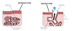 This diagram shows the differences between endocrine and exocrine glands. The major difference is that exocrine glands secrete substances out of the body and endocrine glands secrete substances into capillaries and blood vessels.