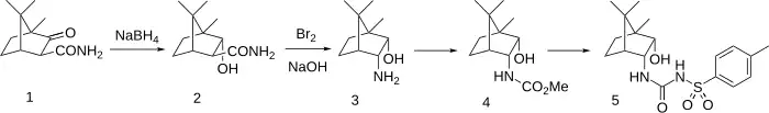 Gliburnide is an endo-endo derivative made from camphor-3-carboxamide by borohydride reduction (exo approach), followed by Hofmann rearrangement to carbamate, followed by displacement with sodium tosylamide.