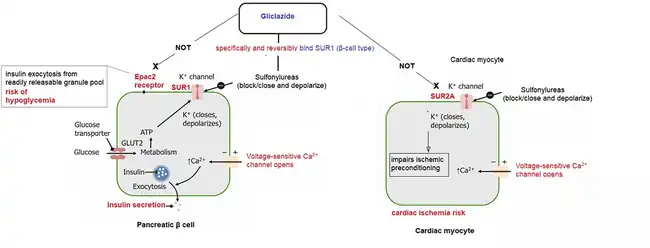 Gliclazide selectively binds to sulfonylurea receptors (SUR-1) on the surface of the pancreatic beta-cells. It was shown to provide cardiovascular protection as it does not bind to sulfonylurea receptors (SUR-2A) in the heart.[14]