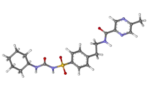 Glipizide, sold under the brand name Glucotrol among others, is an anti-diabetic medication of the sulfonylurea class used to treat type 2 diabetes.[1] It is used together with a diabetic diet and exercise.[1][3] It is not indicated for use by itself in type 1 diabetes.[1] It is taken by mouth.[1] Effects generally begin within half an hour and can last for up to a day.[1]