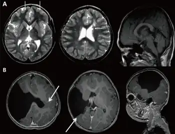 | a) Brain magnetic resonance imaging with global developmental delay (and increased serum creatine kinase) b) global developmental delay (and left hemiplegia ) | |