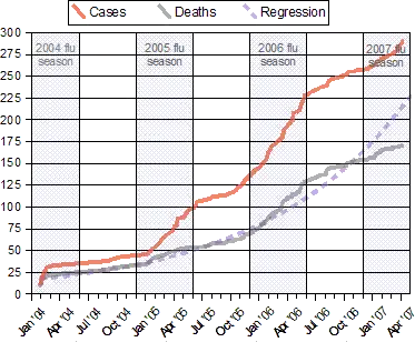 - February 28, 2008: There are no indications that H5N1 is becoming a bigger problem in China despite the deaths of three people from the disease this year, the World Health Organisation said Wednesday.[32]