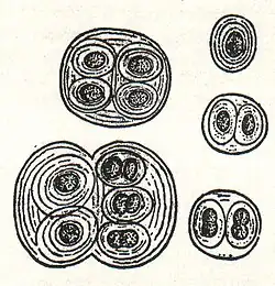 Gloeocapsa (from the Greek gloia (gelatinous) and the Latin capsa (case)) is a genus of cyanobacteria.[2] The cells secrete individual gelatinous sheaths which can often be seen as sheaths around recently divided cells within outer sheaths. Recently divided cell pairs often appear to be only one cell since the new cells cohere temporarily. They are also known as glow caps, a term derived from the yellowish hue given off by the cap.
