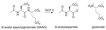 GCPII has been shown to both indirectly and directly increase the concentration of glutamate in the extracellular space.[38] GCPII directly cleaves NAAG into NAA and glutamate.[7][8] NAAG has been shown, in high concentration, to indirectly inhibit the release of neurotransmitters, such as GABA and glutamate. It does this through interaction with and activation of presynaptic group II mGluRs.[38] Thus, in the presence of NAAG peptidase, the concentration of NAAG is kept in check, and glutamate and GABA, among other neurotransmitters, are not inhibited.
