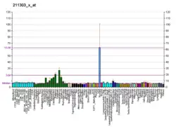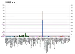 Human PSMA is highly expressed in the prostate, roughly a hundred times greater than in most other tissues. In some prostate cancers, PSMA is the second-most upregulated gene product, with an 8- to 12-fold increase over levels in noncancerous prostate cells.[19] Because of this high expression, PSMA is being developed as potential biomarker for therapy and imaging of some cancers.[20] In human prostate cancer, the higher expressing tumors are associated with quicker time to progression and a greater percentage of patients suffering relapse.[21][22] In vitro studies using prostate and breast cancer cell lines with decreased PSMA levels showed a significant decrease in the proliferation, migration, invasion, adhesion and survival of the cells.[23]