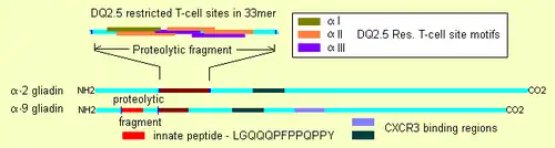 {{cite journal}}: CS1 maint: multiple names: authors list (link) - ↑ 1 "α-I" site, 3 "α-II" sites, and 2 "α-III" sites, Qiao SW, Bergseng E, Molberg Ø; et al. (August 2004). "Antigen presentation to celiac lesion-derived T cells of a 33-mer gliadin peptide naturally formed by gastrointestinal digestion". J. Immunol. 173 (3): 1757–62. doi:10.4049/jimmunol.173.3.1757. PMID 15265905.