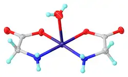 Glycine functions as a bidentate ligand for many metal ions, forming amino acid complexes.[37] A typical complex is Cu(glycinate)2, i.e. Cu(H2NCH2CO2)2, which exists both in cis and trans isomers.[38][39]