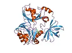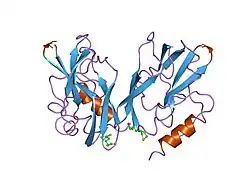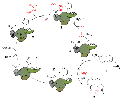 In the enzymatic reaction, H-protein activates the P-protein, which catalyzes the decarboxylation of glycine and attaches the intermediate molecule to the H-protein to be shuttled to the T-protein.[4][5] The H-protein forms a complex with the T-protein that uses tetrahydrofolate and yields ammonia and 5,10-methylenetetrahydrofolate. After interaction with the T-protein, the H-protein is left with two fully reduced thiol groups in the lipoate group.[6] The glycine protein system is regenerated when the H-protein is oxidized to regenerate the disulfide bond in the active site by interaction with the L-protein, which reduces NAD+ to NADH and H+.