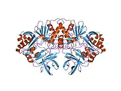 The glycine cleavage system (GCS) is also known as the glycine decarboxylase complex or GDC. The system is a series of enzymes that are triggered in response to high concentrations of the amino acid glycine.[1] The same set of enzymes is sometimes referred to as glycine synthase when it runs in the reverse direction to form glycine.[2] The glycine cleavage system is composed of four proteins: the T-protein, P-protein, L-protein, and H-protein. They do not form a stable complex,[3] so it is more appropriate to call it a "system" instead of a "complex". The H-protein is responsible for interacting with the three other proteins and acts as a shuttle for some of the intermediate products in glycine decarboxylation.[2] In both animals and plants, the glycine cleavage system is loosely attached to the inner membrane of the mitochondria. Mutations in this enzymatic system are linked with glycine encephalopathy.[2]
