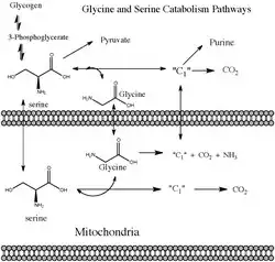 In humans and most vertebrates, the glycine cleavage system is part of the most prominent glycine and serine catabolism pathway. This is due in large part to the formation 5,10-methylenetetrahydrofolate, which is one of the few C1 donors in biosynthesis.[2] In this case the methyl group derived from the catabolism of glycine can be transferred to other key molecules such as purines and methionine.