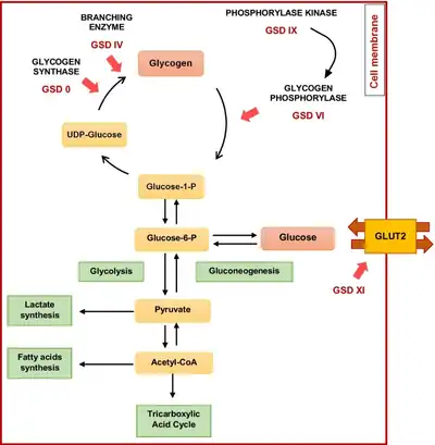 - GSD type XI (GSD 11): Fanconi-Bickel syndrome (GLUT2 deficiency), hepatorenal glycogenosis with renal Fanconi syndrome, no longer considered a glycogen storage disease, but a defect of glucose transport.[5] The designation of GSD type XI (GSD 11) has been repurposed for muscle lactate dehydrogenase deficiency (LDHA).