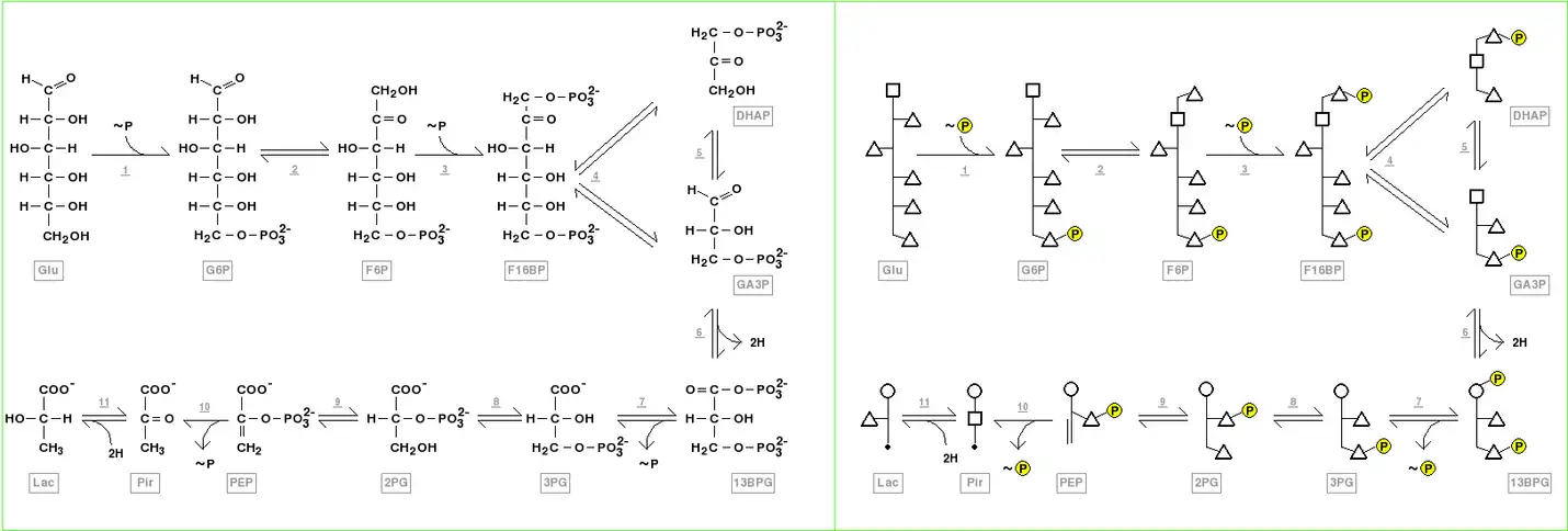 Glycolysis - Structure of anaerobic glycolysis components showed using Fischer projections, left, and polygonal model, right. The compounds correspond to glucose (GLU), glucose 6-phosphate (G6P), fructose 6-phosphate (F6P), fructose 1,6-bisphosphate ( F16BP), dihydroxyacetone phosphate (DHAP), glyceraldehyde 3-phosphate(GA3P), 1,3-bisphosphoglycerate (13BPG), 3-phosphoglycerate (3PG), 2-phosphoglycerate (2PG), phosphoenolpyruvate (PEP), pyruvate (PIR), and lactate (LAC). The enzymes which participate of this pathway are indicated by underlined numbers, and correspond to hexokinase (1), glucose-6-phosphate isomerase (2), phosphofructokinase-1 (3), fructose-bisphosphate aldolase (4), triosephosphate isomerase (5), glyceraldehyde-3-phosphate dehydrogenase (5), phosphoglycerate kinase (7), phosphoglycerate mutase (8), phosphopyruvate hydratase (enolase) (9), pyruvate kinase (10), and lactate dehydrogenase (11). The participant coenzymes (NAD+, NADH + H+, ATP and ADP), inorganic phosphate, H2O and CO2 were omitted in these representations. The phosphorylation reactions from ATP, as well the ADP phosphorylation reactions in later steps of glycolysis are shown as ~P respectively entering or going out the pathway. The oxireduction reactions using NAD+ or NADH are observed as hydrogens "2H" going out or entering the pathway.