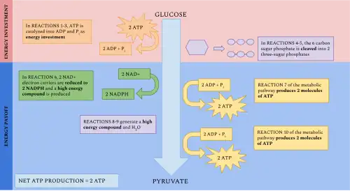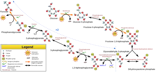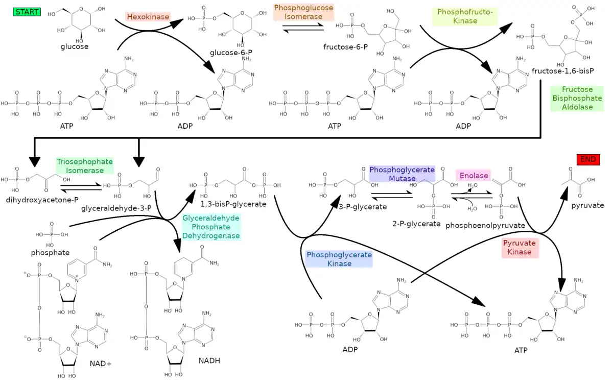 Glycolysis is the metabolic pathway that converts glucose (C6H12O6) into pyruvate and, in most organisms, occurs in the liquid part of cells (the cytosol). The free energy released in this process is used to form the high-energy molecules adenosine triphosphate (ATP) and reduced nicotinamide adenine dinucleotide (NADH).[1] Glycolysis is a sequence of ten reactions catalyzed by enzymes.