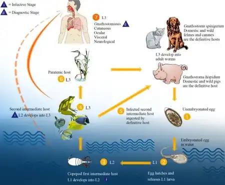 G. spinigerum has a multi-host life history. The eggs hatch in fresh water and the larvae are eaten by water fleas of the genus Cyclops. The water fleas are in turn eaten by small fish. Eventually, the larvae end up in the stomachs of carnivores, usually cats and dogs. The larva bores through the stomach wall and migrates around in the host's body for about three months before returning to the stomach and attaching itself in the gastric mucosa. It then takes another six months to mature. The eggs are carried in the host's feces, and if they reach fresh water the cycle begins again. As humans are not a normal host for the larvae, they do not mature in humans, but can cause various degrees of damage, depending on where the larvae wander in the body.