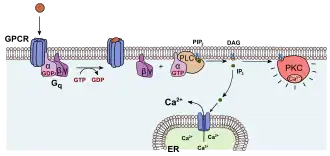 One factor that has an important effect on this electrical activity of gonadotrophs is the gonadotropin-releasing hormone (GnRH). GnRH is a hormone released by the hypothalamus, and it is responsible for signaling gonadotrophs to release gonadotropins FSH and LH. GnRH binds to gonadotropin-releasing hormone receptors (GnRHR), which is a G-protein coupled receptor, and signals the oscillation of calcium that hyperpolarizes gonadotropic cell membranes.[6] This oscillation of calcium ions occurs through the resultant signaling cascade of the GnRH binding to the GnRHR in the plasma membrane of the gonadotroph. The G-protein associated with the GnRHR is activated by the binding of GnRH, which results in increased phospholipase C (PLC) activity in the plasma membrane. PLC cleaves phosphatidylinositol-4,5-biophosphate (PIP2) into inositol triphosphate (IP3) and diacylglycerol (DAG) signals. DAG activates protein kinase C (PKC), which phosphorylates proteins, and IP3 binds to IP3 receptors on the membrane of the endoplasmic reticulum (ER). This binding results in the release of intracellular calcium ions stored within the ER. Therefore, this increase in calcium ions signals the synthesis of secretion of FSH and LH in gonadotrophs.[7] Overall, the fluctuation of calcium levels that is activated by the electrical activity and the signaling pathway within gonadotropic cells collectively contribute to the synthesis and release of gonadotropins that will serve an endocrine function in the reproductive system.