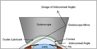 In ophthalmology, gonioscopy is a routine procedure that measures the angle between the iris and the cornea (the iridocorneal angle), using a goniolens (also known as a gonioscope) together with a slit lamp or operating microscope.[1][2] Its use is important in diagnosing and monitoring various eye conditions associated with glaucoma.