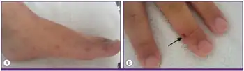 | Skin examination results. a) Many hemorrhagic rashes were noted on the foot. b) Partly necrotic erythematous papule on the finger (black arrow). | |