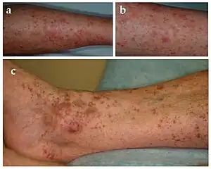 | Purpuric red-brown lichenoid papules on lower extremities | |