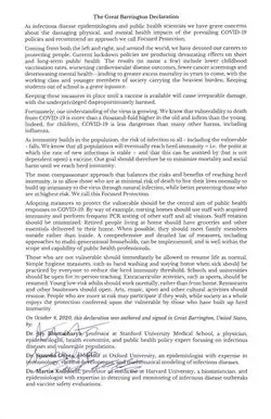 - ↑ Staff (6 October 2020). "expert reaction to Barrington Declaration, an open letter arguing against lockdown policies and for 'Focused Protection'". Science Media Centre. Archived from the original on 14 October 2020. Retrieved 16 October 2020.