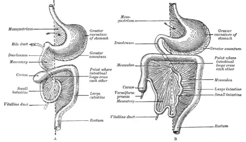 The two layers of the greater omentum descend from the greater curvature of the stomach and the beginning of the duodenum.[2] They pass in front of the small intestines, sometimes as low as the pelvis, before turning on themselves, and ascending as far as the transverse colon, where they separate and enclose that part of the intestine.[2]
