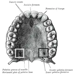 ![]() Permanent teeth of upper dental arch, seen from below. (Greater palatine foramen labeled at lower right.) | |