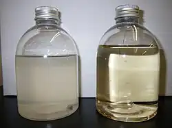 Left: greywater sample from an office building. Right: Same greywater after treatment in membrane bioreactor