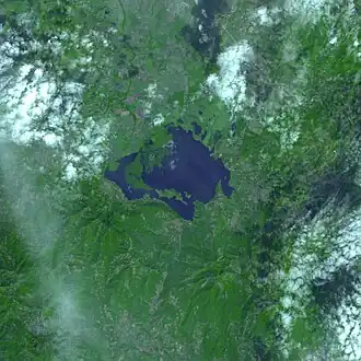 El Salvador counts nearly 360 rivers that connect to form ten hydrographic regions. There are four primary lakes in El Salvador including the Ilopango (72 km2), Guija (44 km2), Coatepeque (24.8 km2), , Olomega ( 24.2 km2) and four reservoirs created by hydroelectric dams discussed in more detail below. El Salvador also obtains about 7.5 km3 of surface water per year from neighboring Honduras and Guatemala.[8] The Cerrón Grande Reservoir, known locally as Lake Suchitlán, is the largest body of fresh water in El Salvador.[9]