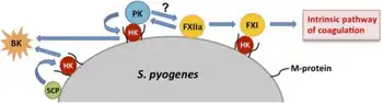 In terms of the mechanism of this infection one finds that a ability by group A streptococcus to fight off phagocytosis is apparently related to factor H and fibrinogen binding by M protein, as well as to disarming complement component C5a.[55]