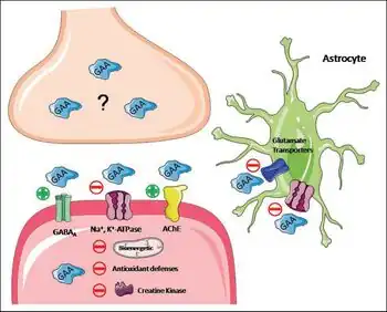 | (Suggested) mechanisms of neurochemical effects of GAA accumulation in the brain. Under GAMT deficiency, there is uptake of GAA from the periphery and GAA synthesis in the neuron occurring mainly in the mitochondria intermembrane space via AGAT.[1] | |