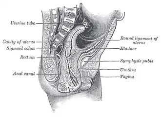 ![]() Sagittal section through the pelvis of a newly born female child. (Label for round ligament of uterus visible at upper right.) | |