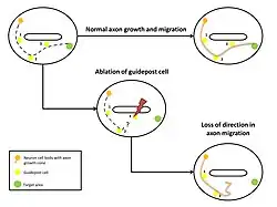 To qualify as a guidepost cell, neurons hypothesized to be influenced by a guidance cell are examined during development.[9] To test the guidance cell in question, neural axon growth and migration is first examined in the presence of the guidance cell.[9] Then, the guidance cell is destroyed to further examine neural axon growth and migration in the absence of the guidance cell.[10][9] If the neuronal axon extends towards the path in the presence of the guidance cell and loses its path in the absence of the guidance cell, it is qualified as a guidepost cell.[9] Ti1 pioneer neurons are a common example of neurons that require guidepost cells in order to reach their final destination.[6][9] They have to come in contact with three guidepost neurons to reach the CNS: Fe1, Tr1, and Cx1.[6][9] When Cx1 is destroyed, the Ti1 pioneer is unable to reach the CNS.[6][9]