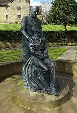 A bronze monument commemorating McIndoe, sculpted by Martin Jennings (whose own father was a Guinea Pig), was unveiled in East Grinstead High Street in 2014. It depicts a seated airman, with his burned hands clawed together, and his scarred face turned to one side. Behind him, resting a reassuring hand on each shoulder, stands the figure of McIndoe. The two figures are encircled by a stone bench.[13]