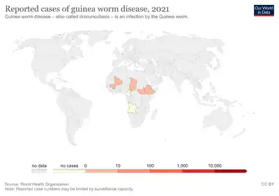 In 2024, 14 cases were reported in two countries, Chad and South Sudan.[4][8] This is down from an estimated 3.5 million cases in 1986.[2] In 2016 the disease occurred in three countries, all in Africa, down from 20 countries in the 1980s.[1][9] It will likely be the first parasitic disease to be globally eradicated.[10] Guinea worm disease has been known since ancient times.[2] The method of removing the worm is described in the Egyptian medical Ebers Papyrus, dating from 1550 BC.[11] The name dracunculiasis is derived from the Latin "affliction with little dragons",[12] while the name "guinea worm" appeared after Europeans saw the disease on the Guinea coast of West Africa in the 17th century.[11] Other Dracunculus species are known to infect various mammals, but do not appear to infect humans.[13][14] Dracunculiasis is classified as a neglected tropical disease.[15] Because dogs may also become infected,[16] the eradication program is monitoring and treating dogs as well.[17]