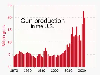 Gun ownership figures are generally estimated via polling, by such organizations as the General Social Survey (GSS), Harris Interactive, and Gallup. There are significant disparities in the results across polls by different organizations, calling into question their reliability.[34] In Gallup's 1972 survey, 43% reported having a gun in their home. GSS's 1973 survey resulted in 49% reporting a gun in the home. In 1993, Gallup's poll results were 51%. GSS's 1994 poll showed 43%.[35] In 2012, Gallup's survey showed 47% of Americans reporting having a gun in their home,[36] while the GSS in 2012 reports 34%.[35] In 2018 it was estimated that U.S. civilians own 393 million firearms,[37] and that 40% to 42% of the households in the country have at least one gun. However, record gun sales followed in the subsequent years.[38][39][40]