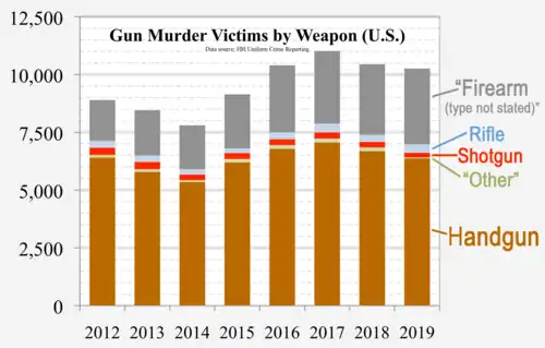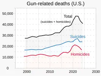 In 2022, up to 100 daily fatalities and hundreds of daily injuries were attributable to gun violence in the United States.[4] In 2018, the most recent year for which data are available, the Centers for Disease Control and Prevention's (CDC) National Center for Health Statistics reported 38,390 deaths by firearm, of which 24,432 were suicides.[5][6] The national rate of firearm deaths rose from 10.3 people for every 100,000 in 1999 to 11.9 people per 100,000 in 2018, equating to over 109 daily deaths (or about 14,542 annual homicides).[7][8][9][10] In 2010, there were 19,392 firearm-related suicides, and 11,078 firearm-related homicides in the U.S.[11] In 2010, 358 murders were reported involving a rifle while 6,009 were reported involving a handgun; another 1,939 were reported with an unspecified type of firearm.[12] In 2011, a total of 478,400 fatal and nonfatal violent crimes were committed with a firearm.[13] In 2023, 350 shootings occurred in K-12 schools with an additional 30 on college campuses. This marked the highest number of shootings recorded on school grounds.[14] In 2023, the Centers for Disease Control and Prevention reported 46,728 firearm-related deaths in the United States, equivalent to a rate of 14.0 per 100,000 people. Suicides made up about 58 percent of these deaths (27,300), while homicides accounted for roughly 38 percent (17,927), with the remainder classified as accidental, law enforcement, or undetermined circumstances.[15][16]