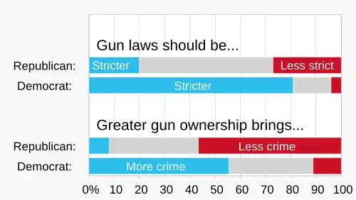 In 2017, compared to 22 other high-income nations, the U.S. gun-related homicide rate was 25 times higher.[100] Although the US has half the population of the other 22 nations combined, among those 22 nations studied, the U.S. had 82 percent of gun deaths, 90 percent of all women killed with guns, 91 percent of children under 14 and 92 percent of young people between ages 15 and 24 killed with guns, with guns being the leading cause of death for children.[100] The ownership and regulation of guns are among the most widely debated issues in the US.