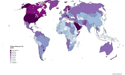 A study conducted by the Journal of the American Medical Association determined that worldwide yearly gun deaths had reached 250,000 by 2018 and that the United States was one of only six countries that collectively accounted for roughly half of those fatalities.[159][160] According to the 2023 Small Arms Survey, there are about 120 guns for every 100 Americans. In other words, there are more civilian guns in the United States than there are people. The rate of deaths from gun violence in the United States is eight times greater than in Canada, which has the seventh-highest rate of gun ownership in the world.[161]