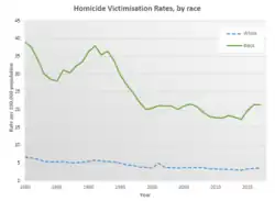 The rising trend in homicide rates during the 1980s and early 1990s was most pronounced among lower income and especially unemployed males. Youths and Hispanic and African American males in the U.S. were the most represented, with the injury and death rates tripling for black males aged 13 to 17 and doubling for black males aged 18 to 24.[115][116] The rise in crack cocaine use in cities across the U.S. has been cited as a factor for increased gun violence among youths during this time period.[117][118][119] After 1993, gun violence in the United States began a period of dramatic decline.[120][121]