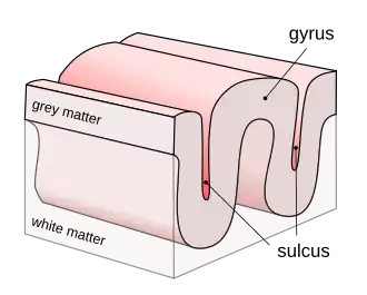In neuroanatomy, a gyrus (pl.: gyri) is a ridge on the cerebral cortex. It is generally surrounded by one or more sulci (depressions or furrows; sg.: sulcus).[1] Gyri and sulci create the folded appearance of the brain in humans and other mammals.