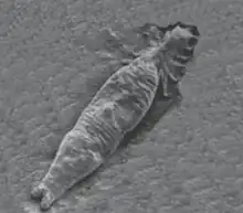 The parasite is 0.5 mm (0.02 in) long,[2] and cannot be seen with the naked eye, but it can be seen with a magnifying glass.[6] On its posterior end is a haptor, a specialized organ for attaching to the host fish, which has sixteen hooks around its edge.[2] The parasite is viviparous, that is, it produces live offspring.[7] The parasites give birth to live young nearly as big as themselves and at this time, a further generation is already growing inside the neonates.[4]