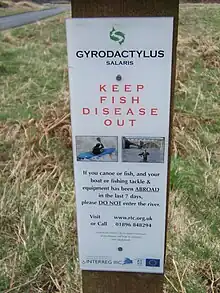 - ↑ "Do not spread salmon parasite Gyrodactylus salaris" (PDF). Finnish Ministry of Agriculture and Forestry. Archived from the original (PDF) on 30 August 2005. Retrieved 11 November 2010.
