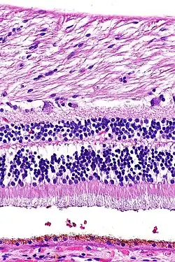 Retina (part of the eye) stained with hematoxylin and eosin, cell nuclei stained blue-purple and extracellular material stained pink