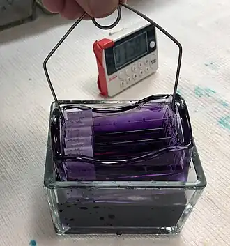 Rack of slides being removed from a bath of hematoxylin stain
