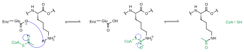 Proteins are typically acetylated on lysine residues, and the acetylation reaction relies on acetyl-coenzyme A as the acetyl group donor. In histone acetylation and deacetylation, histone proteins are acetylated and deacetylated on lysine residues in the N-terminal tail as part of gene regulation. Typically, these reactions are catalyzed by enzymes with histone acetyltransferase (HAT) or histone deacetylase (HDAC) activity, although HATs and HDACs can modify the acetylation status of non-histone proteins as well.[1]