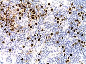 | Micrograph of HHV8-associated Castleman's Disease showing LANA-1 positive lymphoblasts in a regressed germinal center and mantle zone. LANA-1 stain. | |